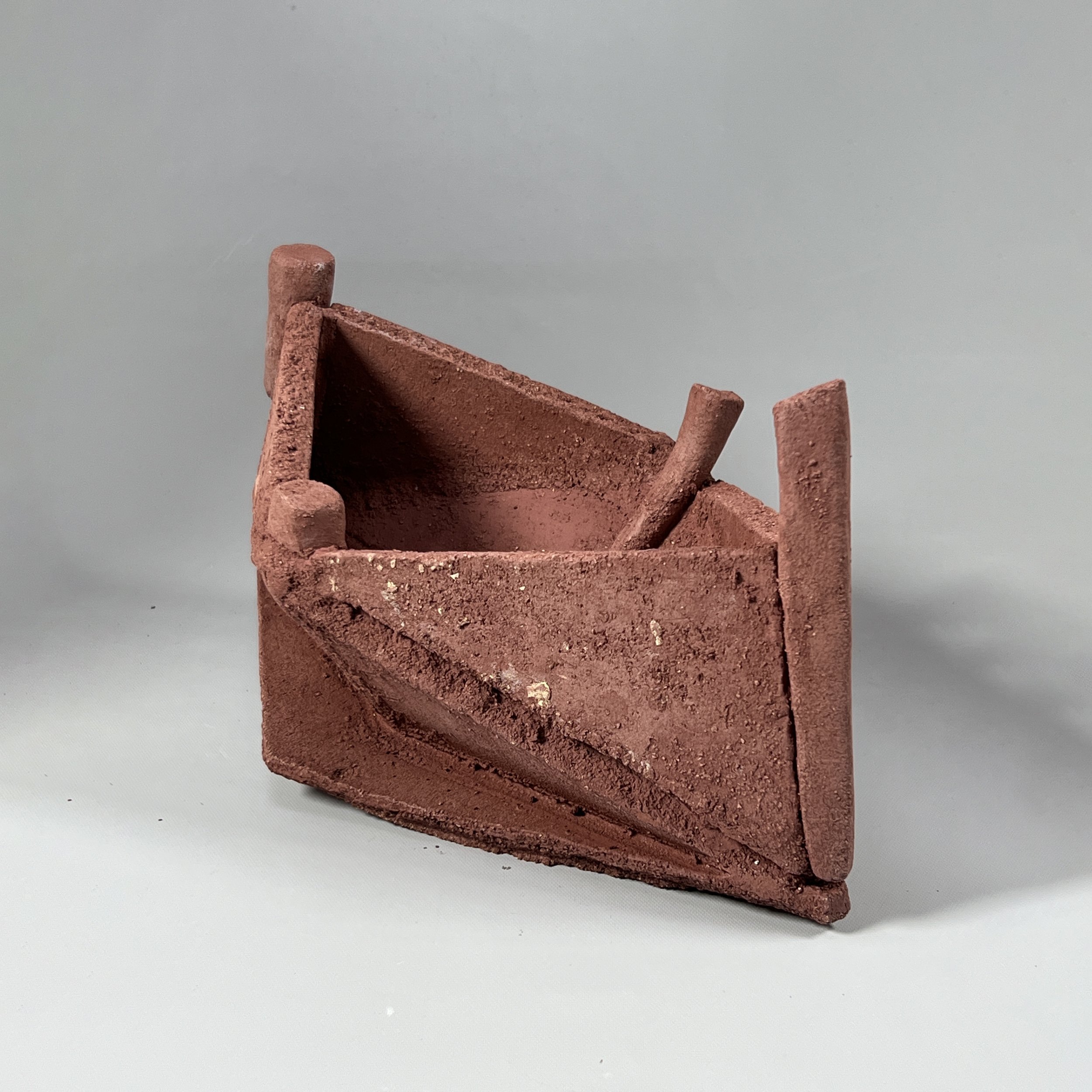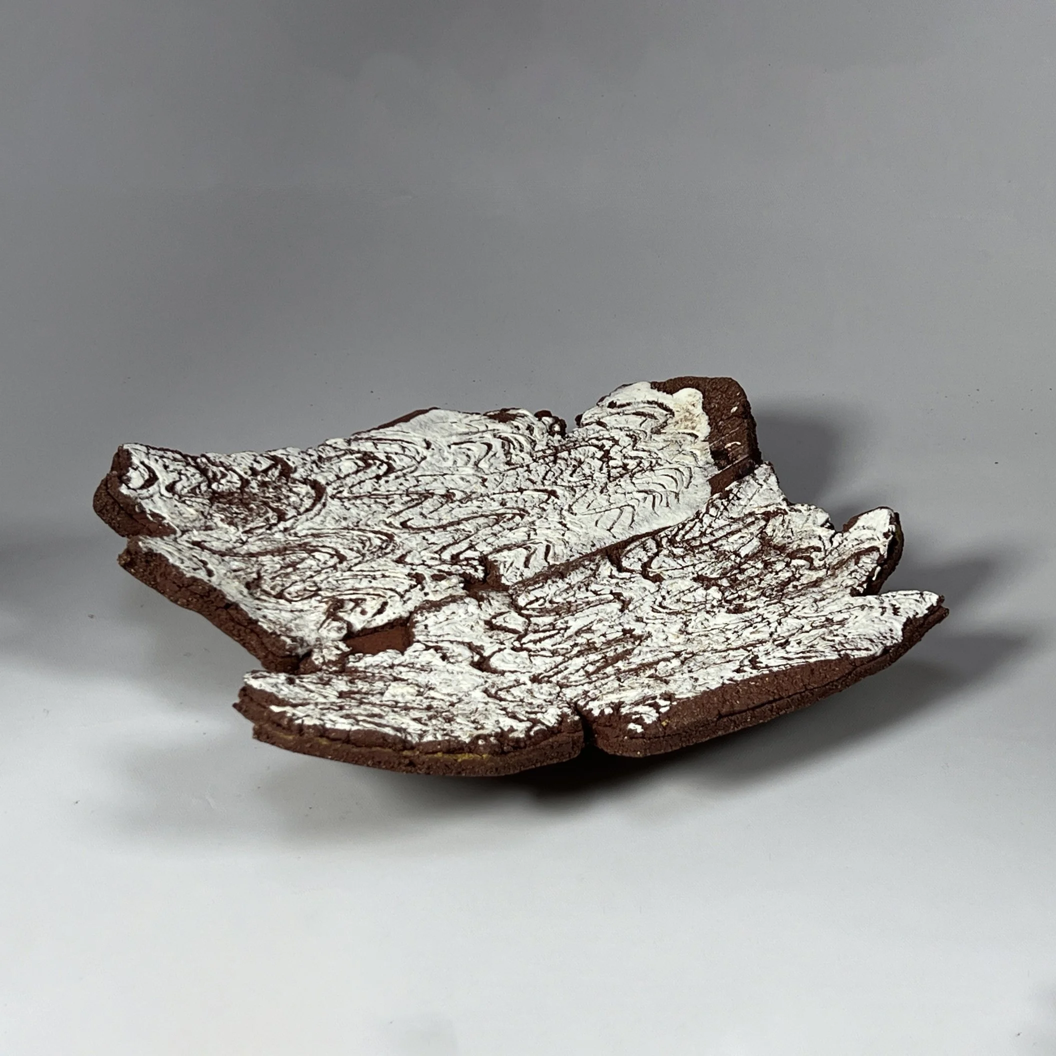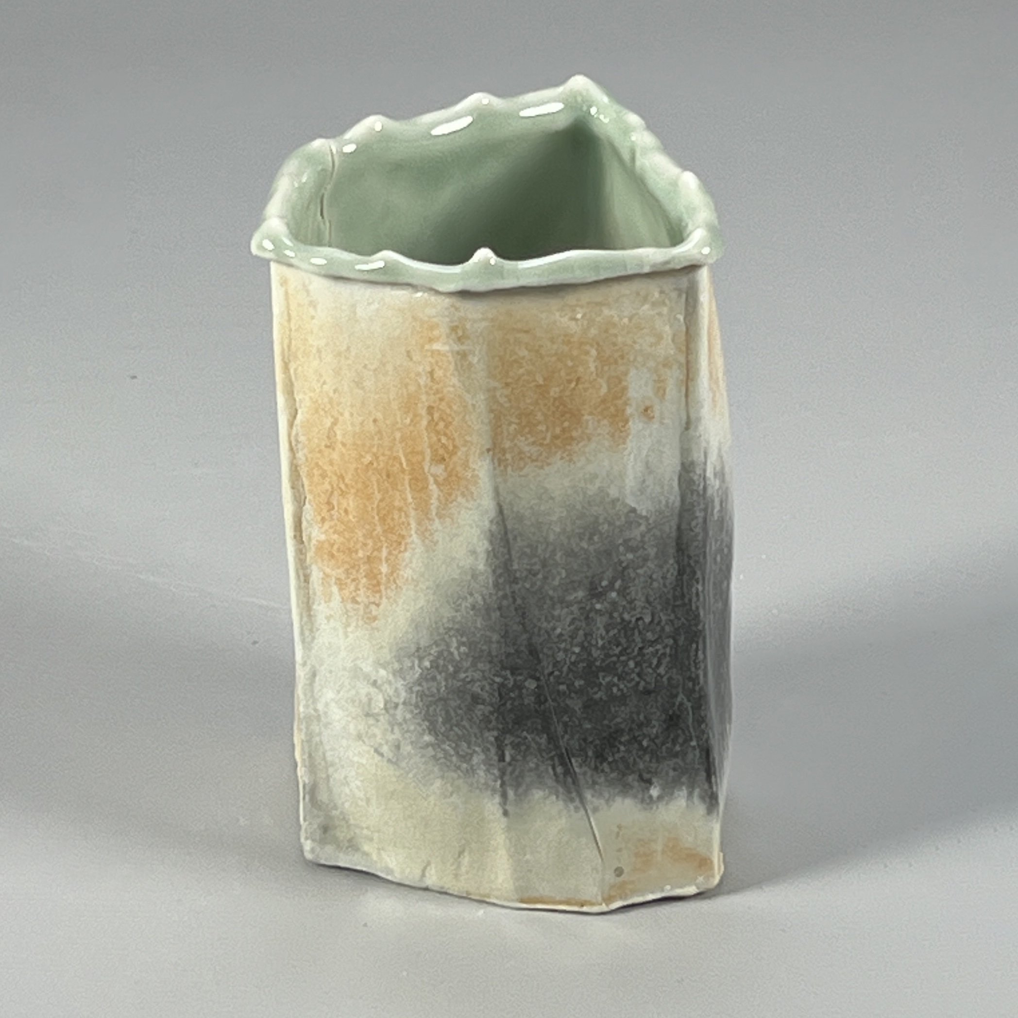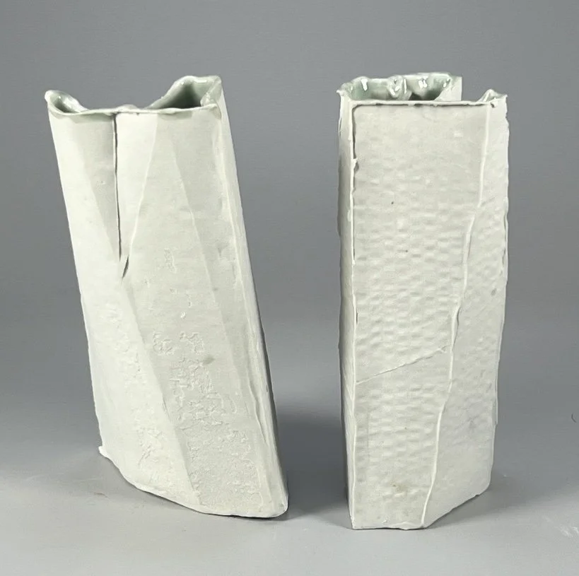 Stoneware and paperclay porcelain clays. Paperclay porcelain is poured into constructed single use cardboard molds allowing me to progressively explore unconventional iterations of simple geometric shapes. Surface texture and glaze development are also important components of my work. Larger pieces are handbuilt with robust stoneward clays using some of the same forms of the cardboard molds. Pieces are fired in either an electric or gas kiln. If fired in the gas kiln, some soda ash may be added for flashing on the clay.